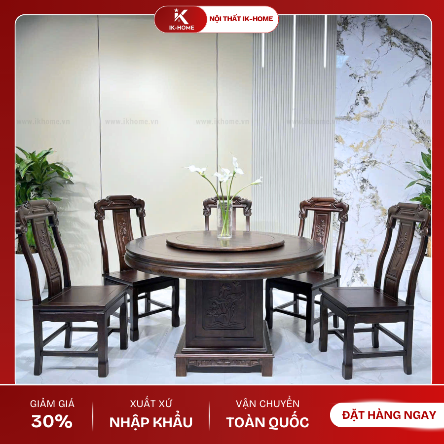 | Chất liệu | Bộ bàn ăn tròn, kèm theo 6 ghế Gỗ Gụ Nam Phi, nhiều lớp |